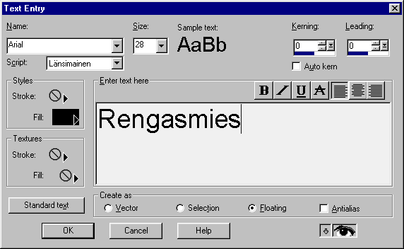 | Ikkunasta voit valita fontin, fontin tyylin ja fontin koon. Ruksaamalla antialiaksen saat tekstin reunat pehmeämmiksi. Normaali teksti tehdään kuvaan kelluvana (Create as = Floating). Kun olet valinnut ikkunan asetukset, voit kirjoittaa haluamasi tekstin ikkunassa olevaan tekstitilaan ja hyväksy lopuksi ikkuna OK:lla. |