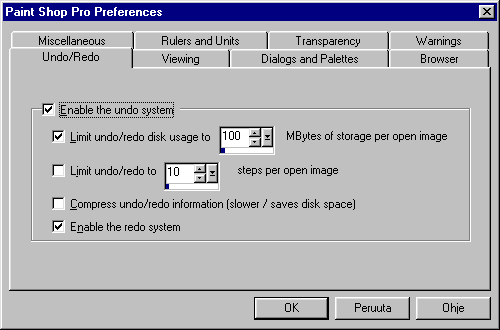 | Valitse seuraavaksi ikkunasta välilehti Undo, ja katso, että ruudussa Enable the undo system on ruksi ja että myös ruudussa Limit undo disk usage to on ruksi. Sen jälkeen voit laittaa em. riville nuolien avulla luvun, jonka verran haluat luovuttaa muistitilaa Undo-systeemille. Huomioi kuitenkin se, että mikäli varaamasi muistitila on pienempi kuin käsittelemäsi kuvan tiedostokoko, ei muistiin mahdu ainuttakaan tehtyä toimenpidettä. Jos Undo-systeemille varattu muistitila taas on kovin suuri, loppuu käytössäsi oleva työmuisti nopeasti ja sitä ei riitä muuhun käyttöön. Kun olet muuttanut Undo-systeemin muistitilan kokoa, astuu muutos voimaan vasta kun ohjelma käynnistetään uudelleen. |